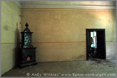Normalerweise sind leer stehende Adelshäuser in Rumänien entweder zugänglich (und kein Mensch kümmert sich um interessierte Besucher) oder das Betreten ist offensichtlich untersagt. Hier war beides nicht der Fall. Zumindest aber durfte ich meine Fotos behalten, auch wenn ich leider nicht alles gesehen hatte.