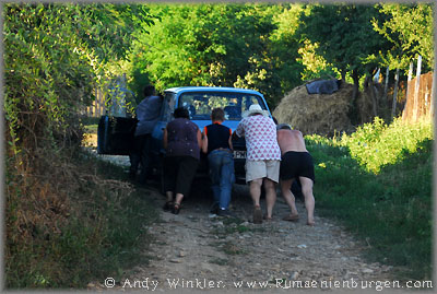 Albert stieg für Fotos an der Bauernburg im Ort aus, ich brachte in der Zwischenzeit Andreas und Meinolf zurück zu ihrem Haus. Auf dem weiteren Weg hielt ich für Albert noch an der Grefenburg von Calnic (Kelling). Während er seine Fotos machte, kam eine bettelnde Zigeunerfamilie ans Auto, so dass ich wieder einstieg und die Türen verschloss.