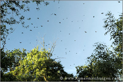 Unzählige Raben über dem Castelul Ambrozy in Remetea Mare /