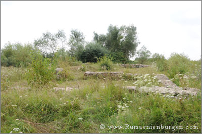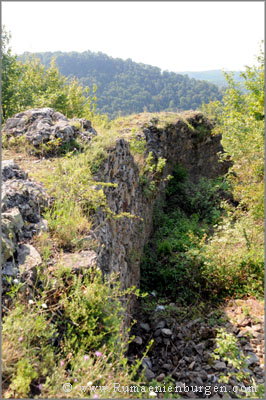 Die Burgruine von Faget (dt. Fatschet), die wir anschließend anfuhren, war ausgeschildert und wir folgten den Hinweisen. Auf einem Feldweg endeten diese jedoch, weshalb wir nicht wussten, welchen Weg wir nun gehen mussten. Vor uns drei Hügel, die ich trotz der Hitze allesamt ablief - erfolglos. Nach einstündiger Suche wollten wir aufgeben, als ich einen weiteren, etwas tiefer gelegenen Pfad entdeckte. Dieser führte dann auch endlich zur Burgstelle, die gerade mal 200 Meter von der Straße entfernt war. Ein einziges weiteres Schild und uns wäre eine Stunde sinnloses Umherirren erspart geblieben...