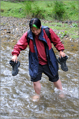 Da es inzwischen schon wieder geregnet hatte, war an den Rückweg über die eh schon morsche und rutschige "Brücke" nicht mehr zu denken. Also machten Birgit und ich beim Gang durch den eiskalten Bach unsere inzwischen fast schon alltägliche Kneipp-Kur ;-)
