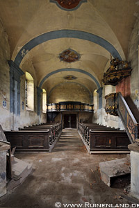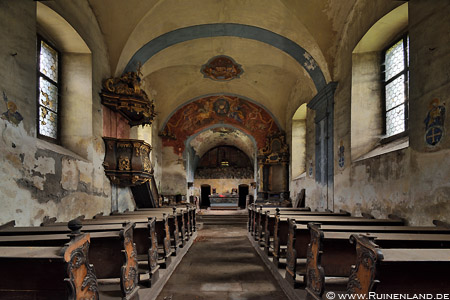 Kanzel, Empore, den Kirchenbänken und mehreren Fresken noch vielerlei