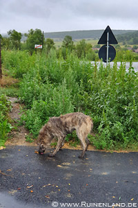 einen hungrigen Straßenhund vor den Toren des Friedhofs zu füttern.