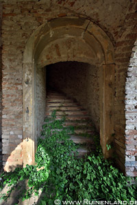 altertümliches Wagenrad im Keller sowie eine mit Efeu bewachsene Treppe. Wieder