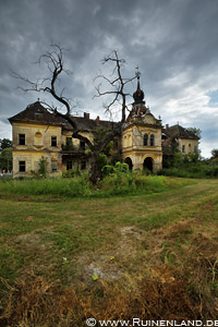 Vor dem Schloss stand ein kahler, knochiger Baum und von außen machte das Anwesen einen recht düsteren Eindruck, was mir für meine Fotos sehr entgegen kam. Im Inneren waren leider bereits mehrere Bereiche eingestürzt und der Westflügel nicht mehr begehbar. Gegen Ende meiner Erkundung stieß ich im Erdgeschoss auf ein Zimmer, dessen Tür sich nicht öffnen ließ. Auf der anderen Seite dieses Raumes war eine weitere Tür, die durch ein großes, quer liegendes Holzbrett versperrt war. Neugierig geworden räumte ich es zur Seite, öffnete die Tür und blickte geschockt auf ein paar nackte, gelblich-schmutzige Füße. Im ersten Moment dachte ich tatsächlich an eine Leiche, mein Herz schlug mir bis zum Hals. Glücklicherweise war dem jedoch nicht so, sondern es handelte sich um einen Obdachlosen, der sich zuvor nicht bemerkbar gemacht hatte, bis er urplötzlich einen lauten Schrei losließ. Erschrocken verließen wir daraufhin schnellen Fußes das Schloss, ohne dass der Mann uns folgte.