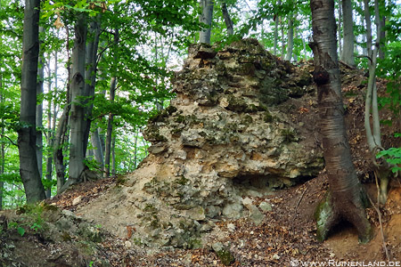Gräben umgebenen Burgstelle nur noch wenige Mauerreste.