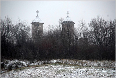 In Arad, eine, wie ich fand, überaus hässliche Stadt, folgte eine regelrechte Irrfahrt. Die Ausschilderung war auf den ersten Blick zwar gut, aber offensichtlich standen manche Schilder entweder an falscher Stelle oder zeigten in die falsche Richtung. Zweimal landete ich jedenfalls in einer Sackgasse. Irgendwann wusste ich gar nicht mehr wo ich war und fuhr einfach nach Gefühl in irgend eine Richtung. Mein Instinkt trog mich nicht und so erreichte ich schließlich Felnac, ein kleiner Ort im Südwesten Arad's, wo auf meiner Karte eine Ruine eingezeichnet war. Viel wusste ich nicht darüber, im Internet fand ich nur spärliche Informationen über die vermutete Datierung sowie über einstige Ausgrabungen. Nach erfolgloser Suche fragte ich im Dorf eine alte Frau nach dem Weg und zeigte ihr die Karte. Sie führte mich zu anderen Leuten und innerhalb kürzester Zeit hatte sich eine kleine, laut diskutierende Menschentraube um mich gebildet. Ich glaubte zu verstehen, dass dort nichts mehr stünde, war mir jedoch nicht sicher. Deshalb rief ich Attila an, erklärte ihm die Situation und reichte mein Handy an einen Dorfbewohner weiter. Dieser erklärte Attila schließlich, dass die von mir gesuchte Stelle etwa 4 Km vom Ort entfernt liegt, kein Weg dorthin führen würde und es quasi keine oberirdischen Mauerreste mehr gäbe. Och nö; bei Dämmerung so weit über einen Acker zu laufen, um dann doch nichts zu sehen - das musste ich nicht haben. Stattdessen legte ich auf der Rückfahrt nach Arad einen kurzen Fotostopp am Kloster nahe Bodrogu Nou ein, auf dessen Zufahrtsstraße beidseitig alle einhundert Meter Kreuze standen.