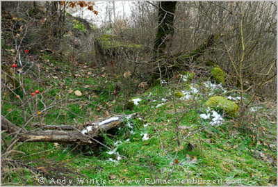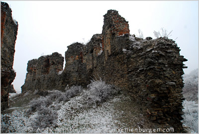 Nur 12 Km von Odvos entfernt stand oberhalb von Lipova (Lippa) die große Ruine der Burg Soimos; sie war mit ein Hauptgrund dafür, dass ich bei meiner diesjährigen Winterreise die Strecke Deva - Arad fuhr. Schon von unten gab sie ein tolles Bild. Ich parkte mein Auto und begann den Aufstieg, der weder weit, noch sonderlich steil war. Dennoch wurde mir mal wieder bewusst, was ich (um mal Hape Kerkeling zu zitieren) für ein "untrainierter Moppel" bin sowie, dass Übergewicht und Zigaretten gepaart mit Burgen eine denkbar ungünstige Kombination sind. Da würde mir morgen mit weiteren Aufstiegen zu zwei Burgruinen ja noch etwas bevorstehen... Der steinige Weg mit seinen vereisten Felsen (warum sieht das Fotos eigentlich immer so harmlos aus?) erschwerte es noch zusätzlich, halbwegs die Balance zu halten.