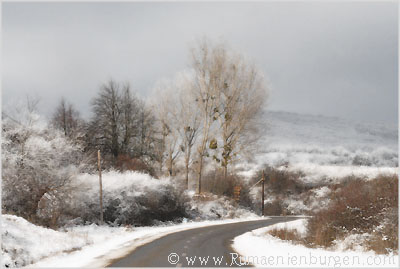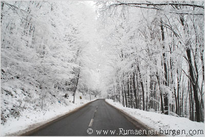 Die Straße über das Gebirge "Muntii Plopisului" (Muntii Sesului) nach Ciucea war für die Rückfahrt nicht unbedingt die beste Wahl. Hinter Valcau de Jos ging die Asphaltierung in holpriges Kopfsteinpflaster über und wenige Kilometer später hörte die Befestigung gänzlich auf. Die Spurrillen und Schlaglöcher wurden immer tiefer, Schnee und Eis immer höher. Trotz teilweiser Schrittgeschwindigkeit setzte ich mit dem Unterboden des Wagens mehrere Male auf und die 30 Km über die Berge ohne jegliche Ausschilderung kam mir wie eine halbe Ewigkeit vor. Wieder huschte ein Fuchs durch den Schnee und wenig später waren weitere Tiere im Wald zu sehen. Ob es sich dabei lediglich um Straßenhunde oder tatsächlich um Wölfe handelte, war aufgrund der einbrechenden Dunkelheit jedoch leider nicht mehr auszumachen.