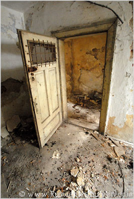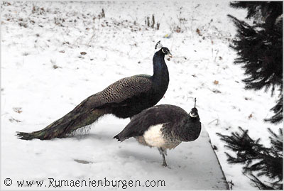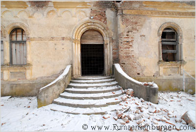Nach etwa einer Stunde kamen wir in Zimbor an und parkten unterhalb des leer stehenden Schlosses Zsombory. Erbaut wurde es 1892, sein letzter Besitzer hieß Saulescu. Dieser verkaufte das Anwesen unlängst weiter, wie uns im Ort von einem älteren Herrn erzählt wurde. Vor einem Nebengebäude liefen Pfaue und Hühner durch den Schnee, durch die vergitterten Fenster des Schlosses konnte man noch die alten rotbraunen Kachelöfen sehen. Leider war lediglich der Keller zugänglich.