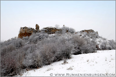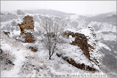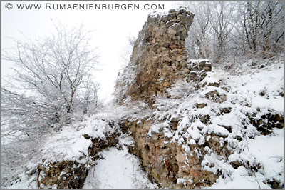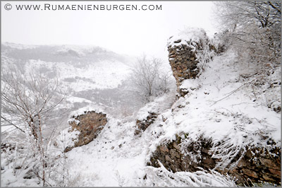 Nichts desto trotz erreichten wir nach gut 40 Km das abgelegene Dörfchen Moara de Padure, parkten am Straßenrand und begannen den Aufstieg zu Cetatea Lita, der Ruine einer ehemaligen Komitatsburg aus dem 13. Jahrhundert. Aus dem Ort liefen uns zwei Hunde zu, die uns fortan durch den Wald begleiteten. Hatte ich den Weg vom Sommer 2006 als einfach in Erinnerung, erwies er sich bei Schnee, auf dem man oberhalb eines ungesicherten Abhangs mehrfach wegrutschte, als umso schwieriger. Miri aus Deutschland gab sich nach einer Viertelstunde geschlagen und ging zurück zum Auto, während Miri aus Cluj, Attila und ich uns weiter nach oben kämpften. Nur wenige Meter später war der Pfad abgegangen, so dass wir uns am Hang entlang schlängeln mussten, bis kurz darauf aufgrund des Schnees gar kein Weg mehr erkennbar war. Umzukehren kam für mich jedoch nicht in Frage, auch wenn der nun folgende Aufstieg querfeldein zugegebenermaßen ziemlich an meinen Kräften zehrte. Anstatt Chips und Cola hätte ich mir in den Wochen zuvor besser etwas Bewegungstraining verordnen sollen... Die beiden Hunde hatten da sichtlich weniger Mühe. ;-)