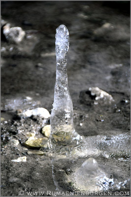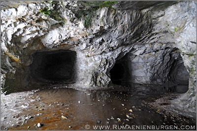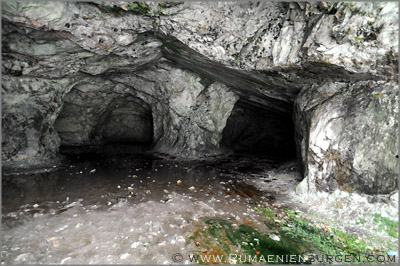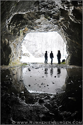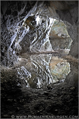 Am Auto bekamen unsere treuen Begleiter als Belohnung natürlich eine Portion Hundefutter. Zurück über Baisoara und weiter Richtung Süden kämpfte sich das Auto die vereiste Straße den Hügel hinauf, was doch ziemlich meine Nerven strapazierte, bis wir im Tal auf der anderen Seite die Pestera de la Buru erreichten. Die künstliche Höhle war nicht sonderlich tief, bot mit Stalagmiten aus Eis und Spiegelungen im Wasser aber dennoch ein schönes Bild.