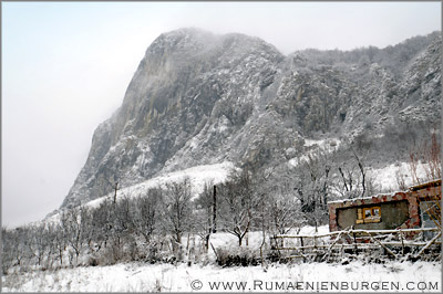 Um 8.00 Uhr nahmen wir den Mietwagen entgegen, trafen uns mit Miri & Attila und fuhren nach einem kurzen Einkauf von Lebensmitteln Richtung Südosten. Kaum hatten wir die ausgebaute E60 hinter Cluj (Klausenburg) verlassen, wurde schnell deutlich, dass der kleine Mietwagen auf den zwar geräumten, aber nur mit Split gestreuten Nebenstrecken selbst bei unwesentlichen Steigungen hoffnungslos überfordert war. Immer wieder rutschten die Reifen weg und ich hatte auch bei geringem Tempo Mühe, das Auto halbwegs in der Spur zu halten. Entspanntes Fahren sieht anders aus...