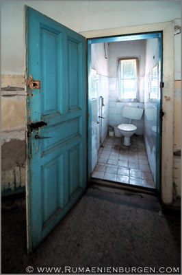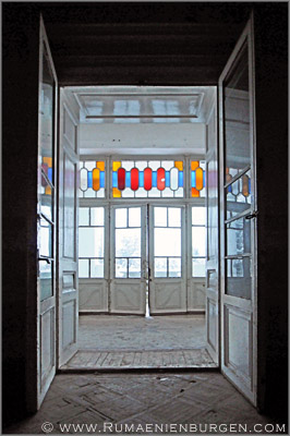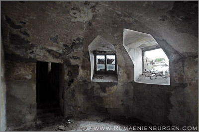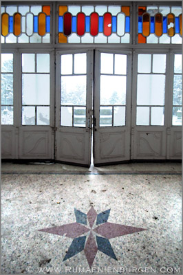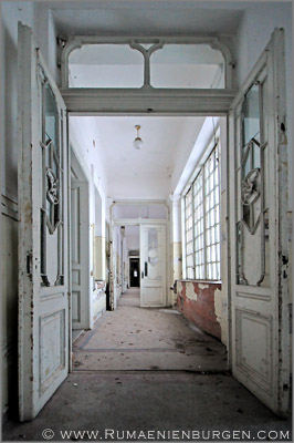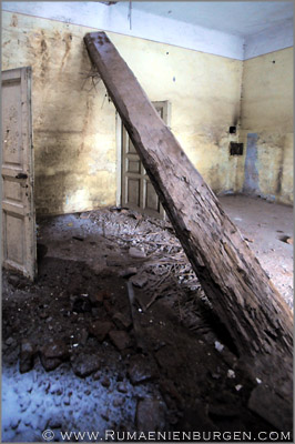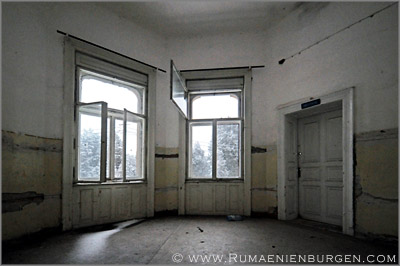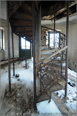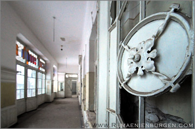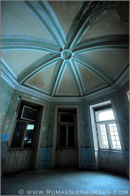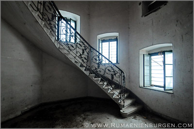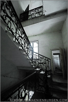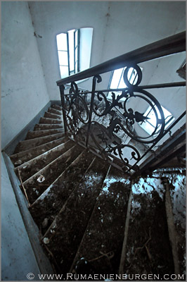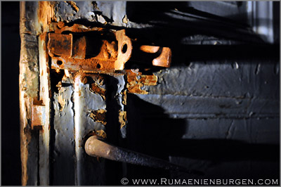 Notgedrungen ließen wir Coltesti unverrichteter Dinge hinter uns und folgten der Straße durch die Schlucht von Valisoara nach Aiud, bis wir am späten Nachmittag in der Ortschaft Sancrai (Königsdorf) ankamen. Erst vor kurzem hatte ich über GoogleEarth das dortige Castelul Kemeny ausfindig gemacht, ein verlassenes Schloss aus dem Jahr 1890, in dem zuletzt wohl eine Schule und / oder Klinik untergebracht war. Die Räume waren wie erwartet weitestgehend leer und auch die Bausubstanz ließ bereits sehr zu wünschen übrig, aber dennoch gab es mit Stuckdecken, rostigen Türverriegelungen und blätterverzierten Treppengeländern noch einige Motive, die interessant für mich waren. Lediglich, dass ich mein Stativ im Wagen gelassen hatte und deshalb die ISO-Zahl meiner Kamera deutlich hochschrauben musste, um wenigstens halbwegs verwacklungsfreie Aufnahmen zu bekommen, ärgerte mich im Nachhinein.