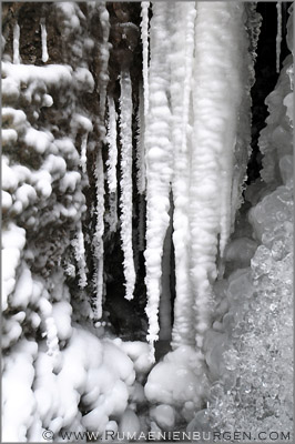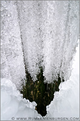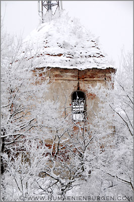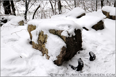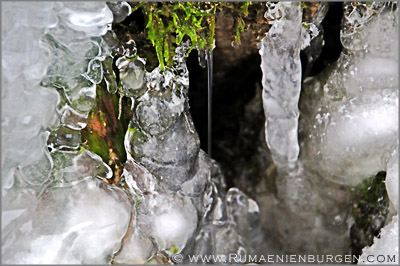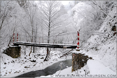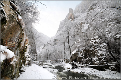 Ursprünglich war nun die Erkundung einer stillgelegten Fabrik eingeplant, die ich auf einer meiner vergangenen Touren entdeckt hatte. In Turda (Thorenburg) angekommen wurde jedoch schnell klar, dass hiervon mittlerweile nur noch ein nacktes Stahlbeton-Skelett steht, welches wenig lohnenswert erschien. Deshalb zögerte ich nicht lange und fuhr weiter nach Cheia (Burgort). Die dortige Cheile Turzii war bereits im Sommer immens schön (siehe Reisebericht von 2007), so dass sie sicherlich auch bei Schnee und Eis ihren Reiz haben würde. Meine Befürchtung, dass die Schlucht im Winter gesperrt sein könnte, erfüllte sich glücklicherweise nicht, wenngleich wir die letzten Kilometer nicht mehr fahren konnten (bzw. hierfür Schneeketten hätten aufziehen müssen). Also parkten wir am Hügel gegenüber der Schlucht und gingen das letzte Stück zu Fuß, wurden für den Weg durch eine buchstäbliche Winterwunderwelt aber mehr als entlohnt.