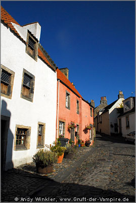 Vorbei an von "National Trust" restaurierten, bunten Häusern aus dem 16. und 17. Jahrhundert stiegen wir durch kleine Gässchen bei strahlender Sonne zur Culross Abbey hinauf. Die Ruinen des Klosters aus dem 13. sowie die Abtei aus dem 17. Jahrhundert mit vorgelagertem Friedhof waren frei zugänglich. Kein Lärm war zu hören, kaum Leute zu sehen; alles war sehr friedlich, fast wie gemalt.