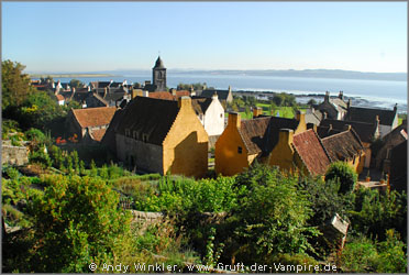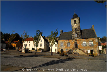 Nach Umsteigen in Dunfermline und Fahrt entlang der Küste erreichten wir Culross. Das kleine, malerische Dorf wirkte wie in einem Dornröschenschlaf. Die Straßen waren leer und der Geruch des Meerwassers wurde von einem sanften Wind zum Marktplatz mit seinen historischen Gebäuden geweht. Lediglich ein Kraftwerk rechts am Horizont trübte das Bild.
