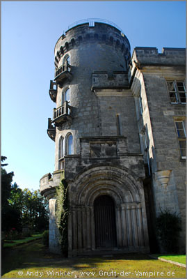Wir liefen weiter entlang der Küste, bis über den Bäumen auf einem Hügel die Turmspitze des Dunimarle Castle auftauchte. Das Schloss, welches 1840 neben den Ruinen von Old Dunimarle Castle errichtet wurde, war ebenfalls Schauplatz im Kinofilm vom kleinen Vampir, darin lebte hier u.a. die Familie von Tony. An der Zufahrt war ein Hinweis, dass das Schloss nicht für Besucher zugänglich sei, zudem wurde vor Hunden gewarnt. Ich wollte das Anwesen jedoch unbedingt fotografieren und stieg entschlossen den kurzen Weg hinauf. Ein Gärtner mähte rückseitig des Schlosses den Rasen, weshalb die Hunde eingesperrt waren und ich ungestört Bilder machen konnte. Wir kamen also genau zum richtigen Zeitpunkt, ein Dank an den Gärtner. ;-)