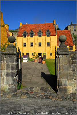 Zurück im Dorf besichtigten wir den inzwischen geöffneten Culross Palace. Erbaut wurde er 1597 - 1611 nicht als Befestigung, sondern als luxuriöses Wohnhaus von George Bruce of Carnock, welcher durch Kohleminen und Salzgewinnung zu Reichtum kam und später zum "Sir" ernannt wurde. Nach einem zehnminütigen, interessanten Videofilm über die Geschichte von Culross gingen wir durch die mit alten Möbeln und Gemälden verzierten Räume, welche nach fortschreitendem Verfall restauriert wurden. Das "gewölbte Zimmer" ist mit bemalten Wand- & Deckenpanelen bestückt, auf denen mehrere Bilder mit geschichtlichen Darstellungen und Sprüchen zu sehen sind. Bei der Restauration versäumte man es, die Bretter zu nummerieren, so dass es Tage dauerte, bis sie wieder in richtiger Reihenfolge angebracht werden konnten.