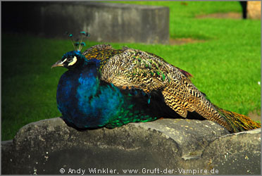 In Dunfermline angekommen kaufte ich mir erst mal zwei Landkarten, bevor Birgit und ich zur dortigen Klosterruine und Abtei gingen. Auf dem Friedhof hingen Spinnennetze an verzierten Kreuzen, die im Sonnenlicht leuchteten; mehrere Eichhörnchen sprangen über die Wiese und auf einem Grabstein sonnte sich ein Pfau. Bis auf einen Meter ließ er uns an sich herankommen, offensichtlich war er äußerst entspannt und Menschen gewöhnt.