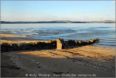 Wir liefen durch immer wechselnde Landschaft entlang der Küste mit Blick auf die Forth Bridge, durch weitläufige Wälder mit Fasanen und Füchsen und vorbei an Hügeln, auf denen Schafe grasten. Nach etwa drei Meilen dachte ich, dass wir nun doch endlich mal ankommen müssten und zweifelte, ob wir überhaupt noch auf dem richtigen Weg seien. So ging ich vom bewaldeten Weg ab zur Küste, in der Hoffnung, dort etwas zu entdecken. Wie sich herausstellte, eine richtige Entscheidung. Zwar waren wir noch nicht ganz am Dalmeny House, der Strand war jedoch mit unzähligen verschiedenen Muscheln bedeckt und man hatte von diesem Standpunkt aus einen schönen Blick auf das bewohnte Barnbougle Castle; ein Towerhouse von 1881, welches auf den Kellergewölben einer älteren Burg errichtet wurde.