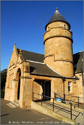 Heute wachte ich 10 Minuten bevor der Wecker klingelte auf. Also quälte ich mich aus dem Bett und ging duschen. Nach einem Frühstück mit Orangensaft, Toast und einem gekochten Ei fuhren wir mit dem Zug nach Linlithgow (vom Zug aus machte ich noch Bilder vom Niddry Castle), wo sich die Schule aus dem Kinofilm vom kleinen Vampir befindet. Verständlicher Weise konnten wir nicht hinein gehen, da die Kinder Unterricht hatten, aber das war auch nicht so wichtig. Hauptsache, ich hatte die Außenaufnahmen.