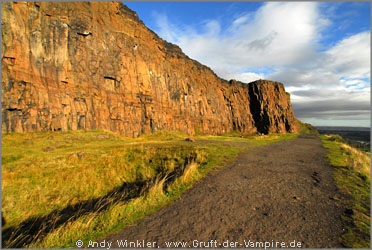 Salisbury Cracks, Edinburgh. Birgit stand oben (der kleine rote Punkt auf dem