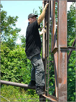 Es war erstaunlich, mit welcher Leichtigkeit das Mädchen den steilen Berg hinauf lief. Oben angekommen waren Birgit und ich doch deutlich außer Puste. Doch anstatt durchzuatmen, schlugen wir uns sogleich durch das Gebüsch, um die Ruine gebührend zu erkunden. Neben Resten der Umfassungsmauern sind noch die Ruinen des Tores sowie des Torhauses zu sehen. Auf dem Gelände befinden sich ein rostiger Funkturm sowie ein ebenso rostiger Bauwagen, welche bereits seit Jahrzehnten hier zu verwittern scheinen. Den Versuch, den Funkturm für ein Foto von oben ein paar Stufen weit zu erklimmen, gab ich schnell wieder auf, da dessen rostige Leiter nur noch sporadisch befestigt war.