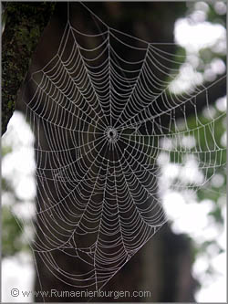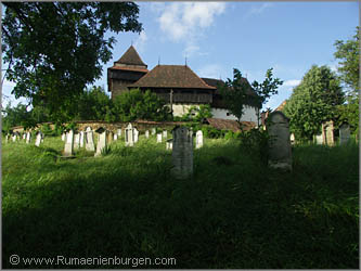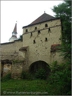 Nachdem ich mir die Kirchenburg in Maierus (Nussbach) angesehen hatte (wo ich eine halbe Ewigkeit an einem Bahnübergang wartete), war Belin (Blumendorf / Blumenau) mein nächstes Ziel, von dessen Kirchenburg ich über GoogeEarth (earth.google.de) Satellitenfotos erhalten hatte. Die Wehranlage selbst war leider verschlossen und aufgrund des Regens und meines verdreckten Aussehens hatte ich wenig Lust, mich im Ort nach dem Schlüssel zu erkundigen. Also ging ich über das Friedhofsgelände um die Kirchenburg herum, von der auch noch die außen liegenden Gräben vorhanden sind. Links der Anlage befand sich rückseitig des Grabens eine Gruft, deren Spalt in der Tür sogar einen Blick in ihr Inneres erlaubte. Verzierte, verwitterte Metallsärge standen dort auf steinernem Podest; ein Bild, wie aus einem Film. Unter dem Giebel der Gruft befand sich zudem ein halbrundes vermoostes Fenster, dessen verzierte Gitterstäbe von einzelnen Spinnwegen behaftet waren.